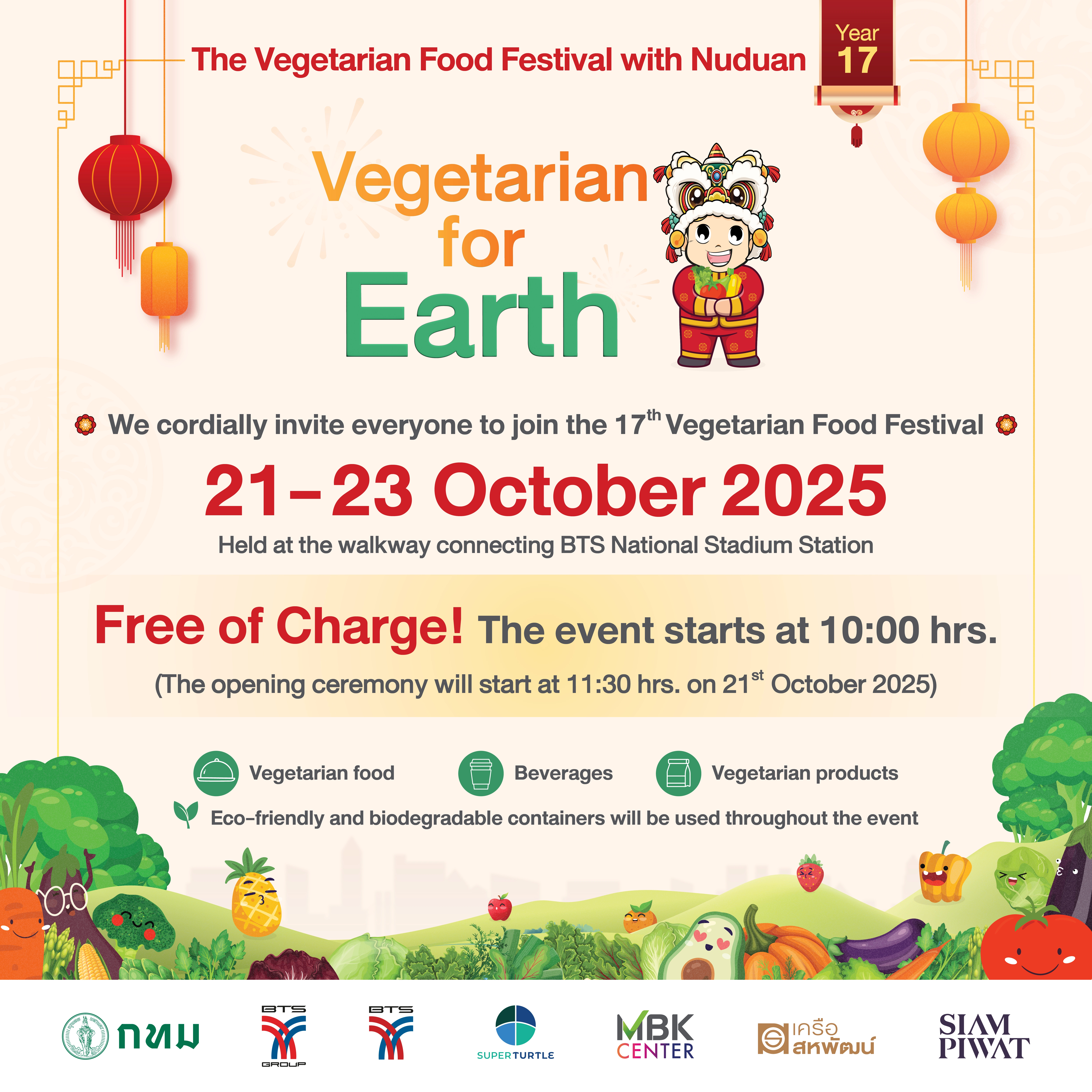Under the theme “Vegetarian for Earth”, the 17th Vegetarian Food Festival with Nuduan will take place from 21 – 23 October 2025, starting at 10.00 hrs. at the walkway connecting the BTS National Stadium Station (W1), organised by BTS Group, in collaboration with the Bangkok Metropolitan Administration, Saha Group, MBK Center, and Siam Piwat Gr oup Co., Ltd.,