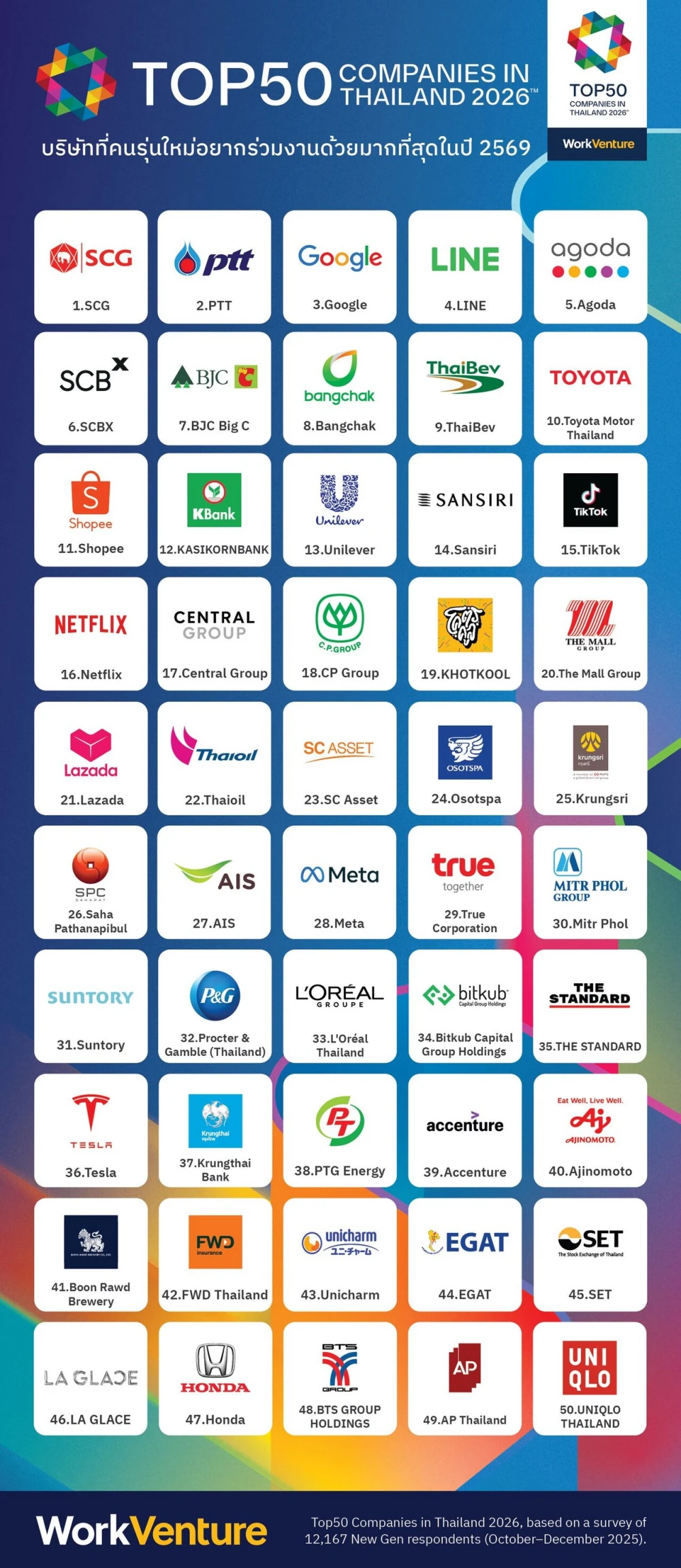 On 9 January 2026, BTS Group Holdings Public Company Limited (“BTS Group”) was ranked 48th among the Top 50 Companies in Thailand 2026 as one of the most desirable organizations for the new generation to work for, based on public voices and votes from young professionals nationwide conducted by WorkVenture. The ranking was compiled from feedback provided by more than 12,000 young professionals across Thailand.